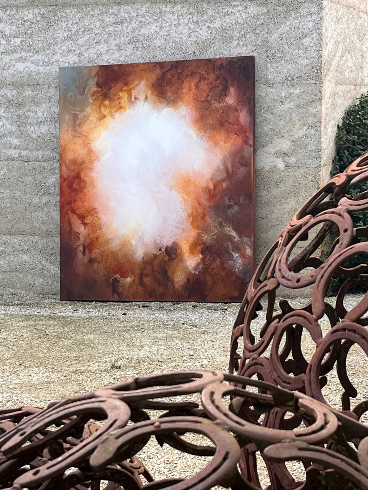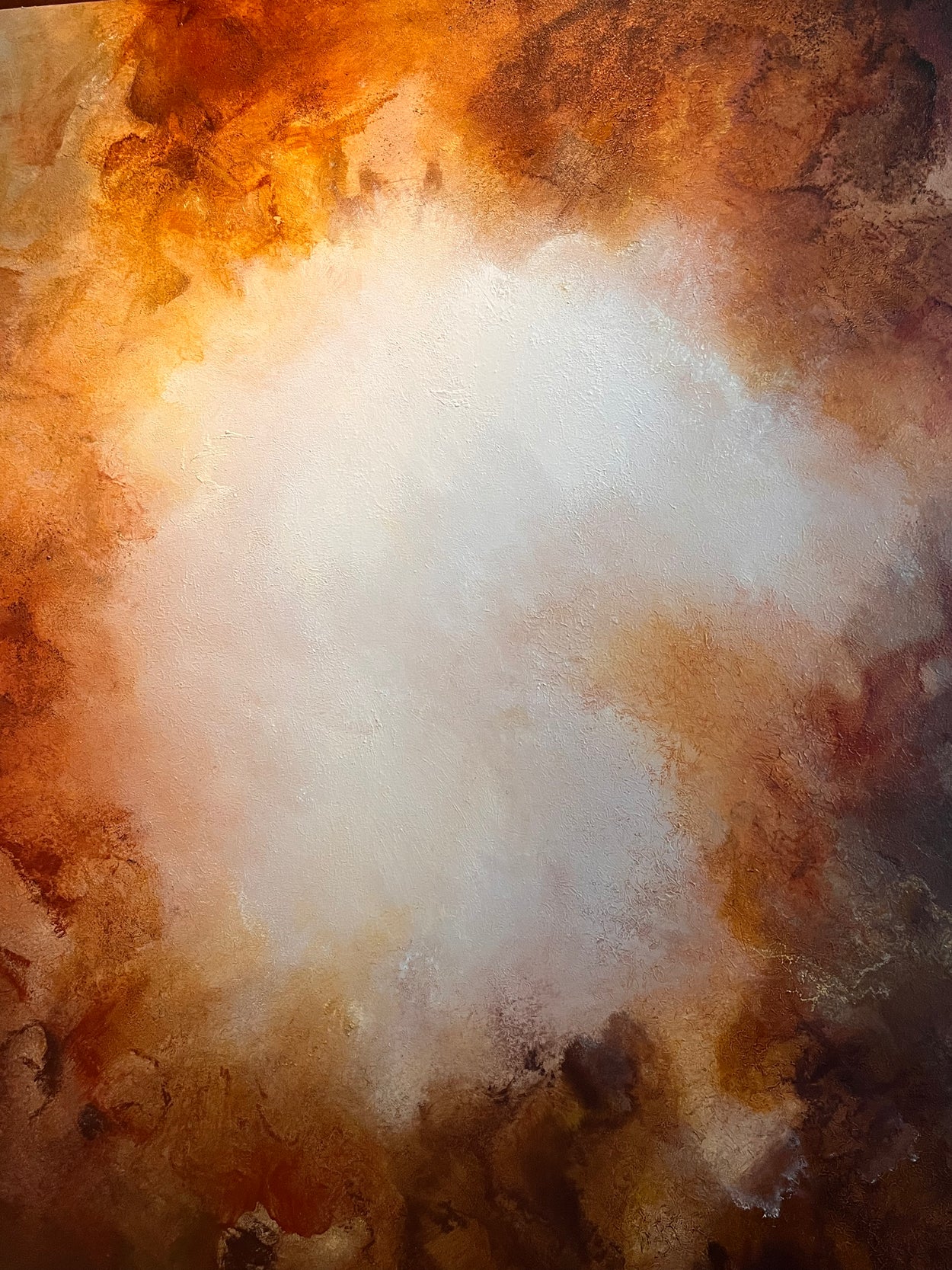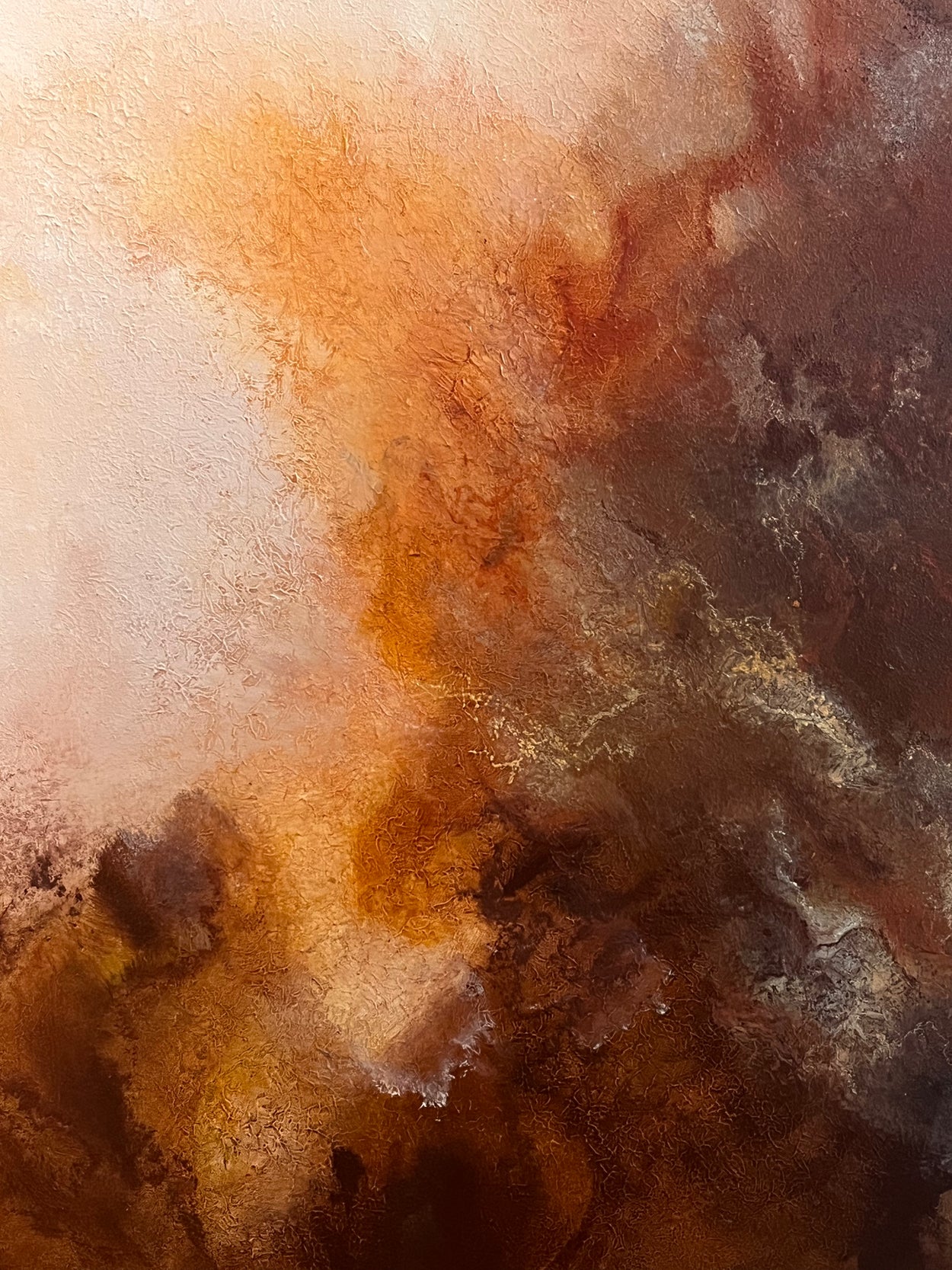 Under the Skin of Light centers on a luminous focal point that radiates outward, commanding attention through its radiant intensity. Rich ochres, deep siennas, and golden ambers create a powerful chromatic foundation, evoking both terrestrial solidity and spiritual elevation.