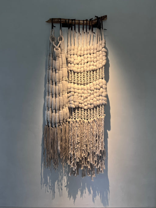 Explore our unique handcrafted textile creations, showcasing an eclectic fusion of natural materials selected for their tactile and aesthetic qualities. These artisanal pieces layers materials as vintage Sakabukuro from Japan, suede, ceramics, felted wool, raw jute, wood and wick wool to create visual depth and textural richness. Each element is thoughtfully integrated to invite visual exploration, resulting in a distinctive work that celebrates material authenticity and refined craftsmanship - an ideal choice to highlight your interior design.