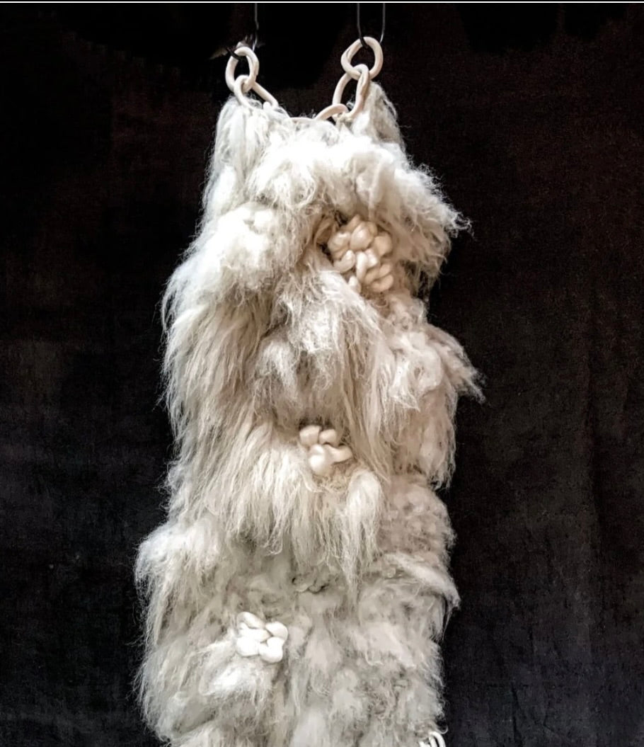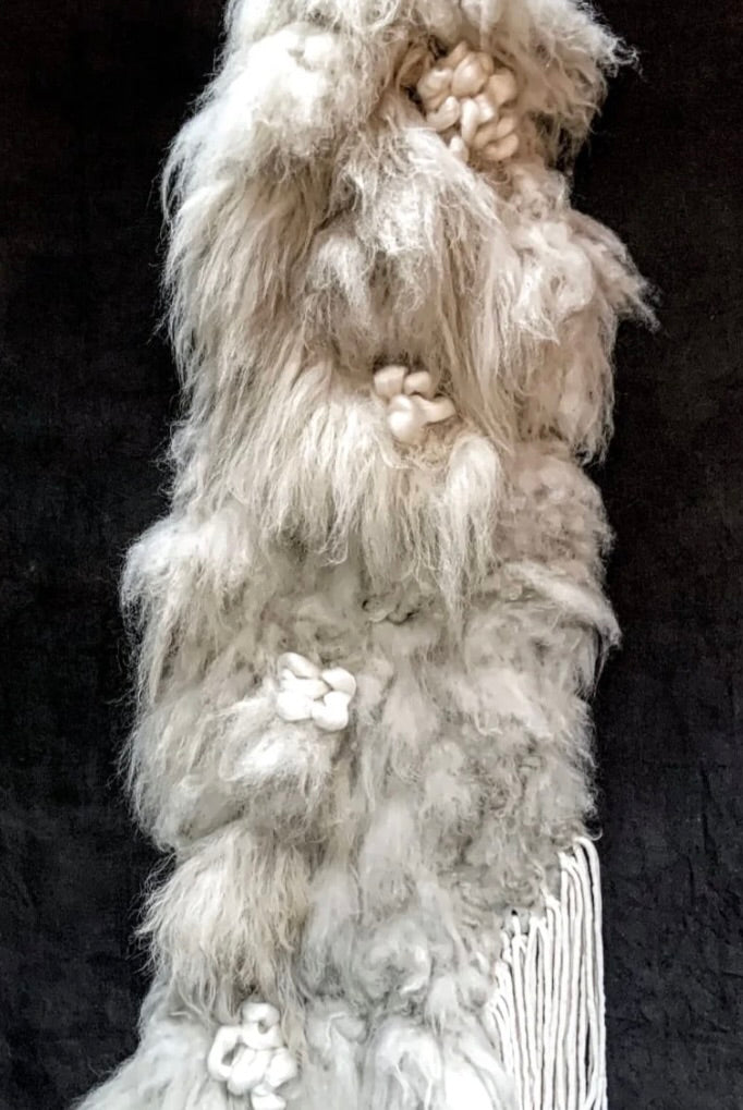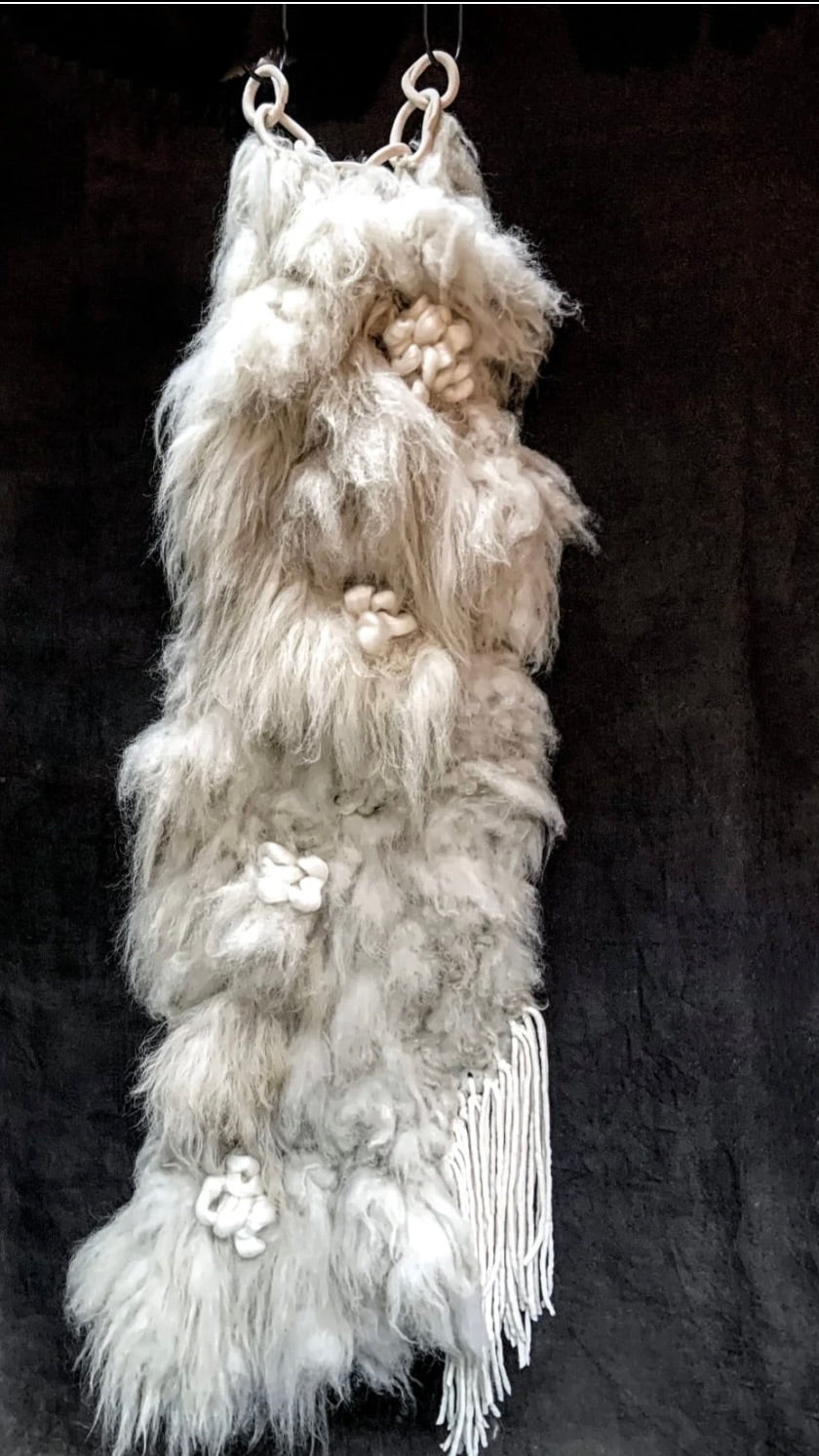 Cloudveil is a tactile wall sculpture that celebrates the interplay of natural textures and warmth. Crafted from raw sheepskin fur, ceramic, felted wool, and mohair wick, this handmade piece features generous, dimensional layers that invite intimate engagement. The combination of soft and structured materials creates an inviting presence—one that seems to embrace the viewer with its organic, enveloping form. Each element is thoughtfully integrated to produce a work of considerable depth and sensory richness, making it a distinctive addition to any interior space.
